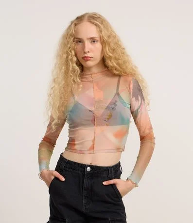 Blusa em Tule Floral com Hibiscos e Golinha Alta