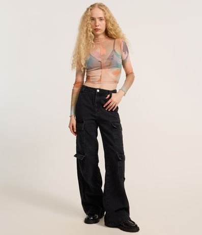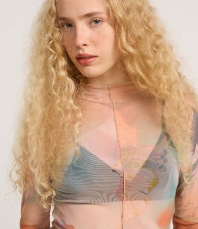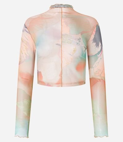 Blusa manga longa, confeccionada em tule floral, golinha alta e com frufru nos punhos.