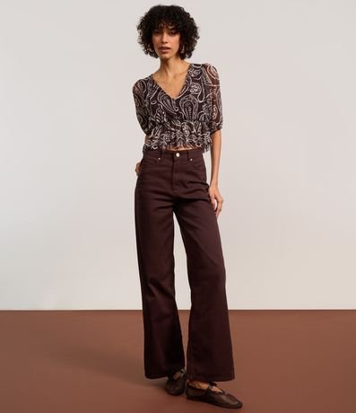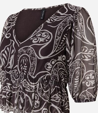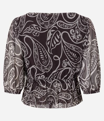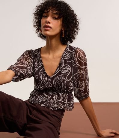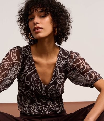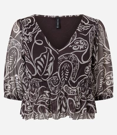 Ref: Blusa manga curta com decote v, confeccionada em tule com forro, elástico na cintura e estampa floral estilo bandana.
