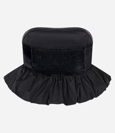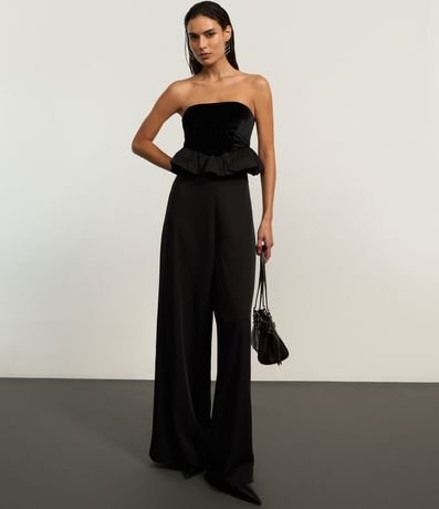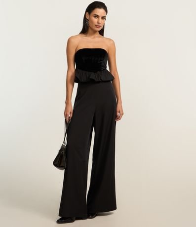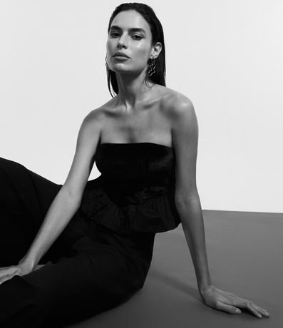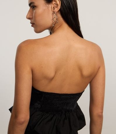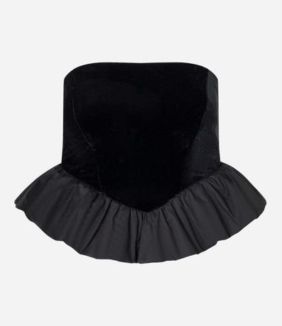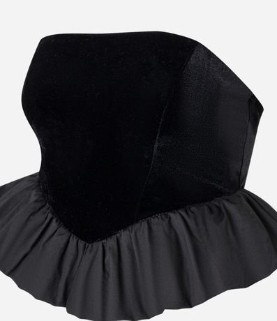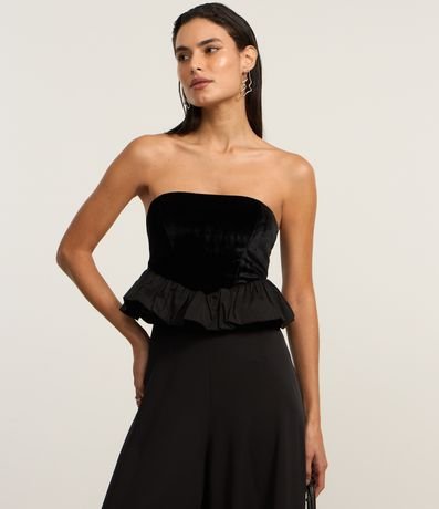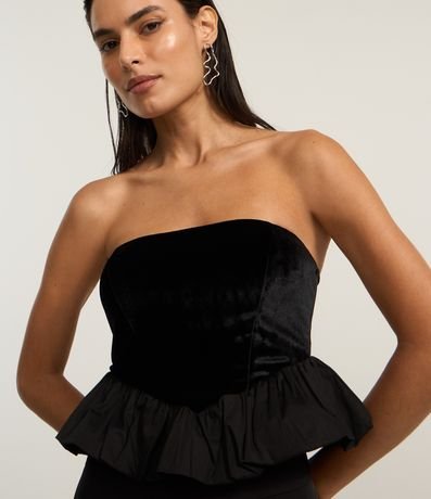 Blusa decote tomara que caia, confeccionado em veludo, recorte v e barra balonê.