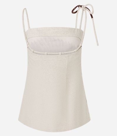Blusa sem mangas, confeccionada em viscolinho com 15% de linho, com decote reto e alcinhas finas. Uma das alças conta com amarração contrastante, além de estampa de folhagem. Este produto possui viscose certificada em sua composição, sendo ambientalmente mais responsável.