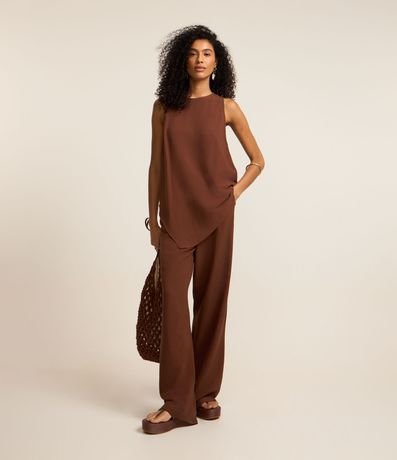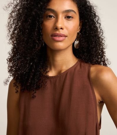 Blusa sem mangas confeccionada em viscolinho mais sustentável com gola redonda e abertura por gota além de barra assimétrica e pontiaguda.
