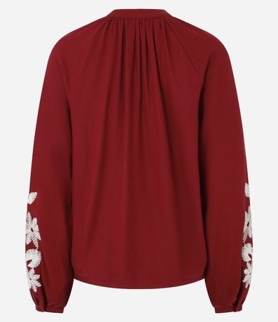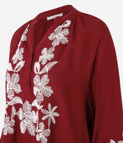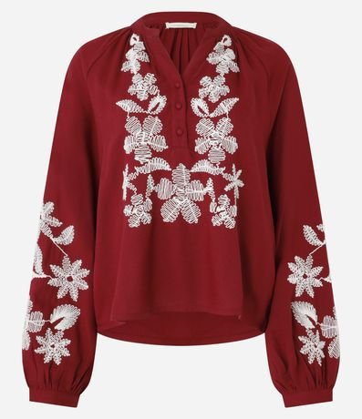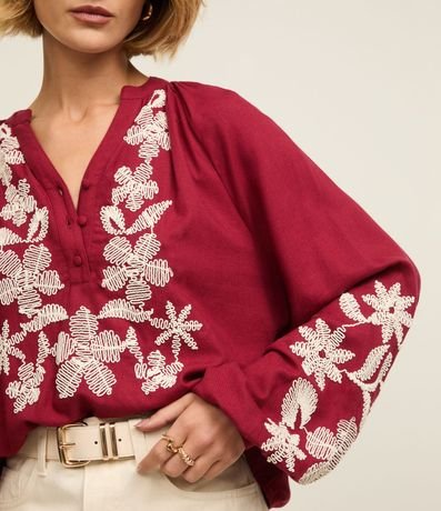 Ref: Blusa bata de mangas longas com elásticos nos punhos, confeccionada em cambraia com viscose mais sustentável e linho, com gola V com botões na vista. A peça tem bordados de flores em linhas na parte frontal e nas mangas.
