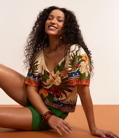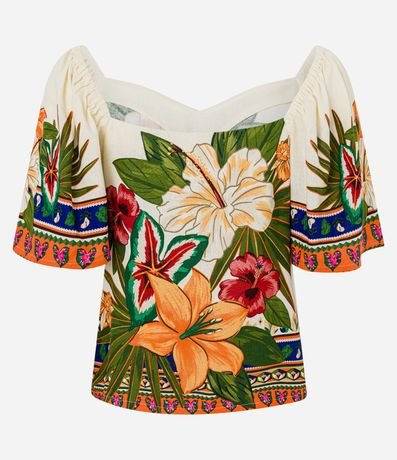 Blusa em Viscolinho com Decote Coração e Estampa Tropical