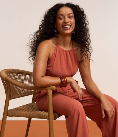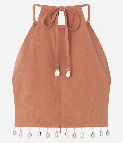 Ref: Blusa feminina confeccionada em viscolinho mais sustentável. Possui decote halter, sem manga, amarração traseira e franja com conchinhas.