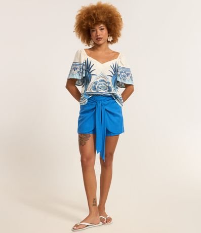 Ref: Blusa feminina confeccionada em viscolinho de viscose certificada, peça com decote em v, manga curta e estampa pontilhada de arara com flores bicolor.