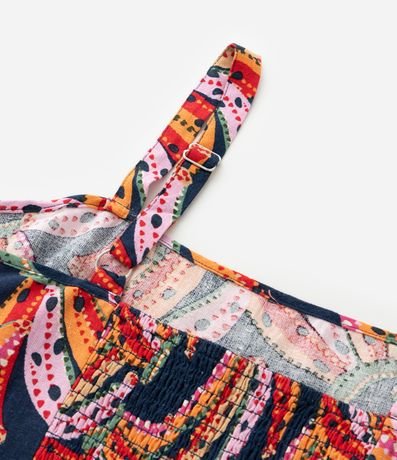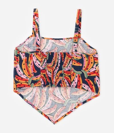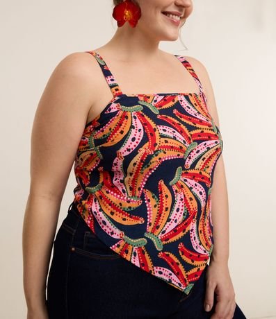 Ref: Blusa de viscolinho com alças reguláveis, lastex nas costas e estampa de bananas. A peça tem uma ponta na parte frontal.