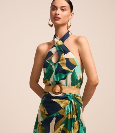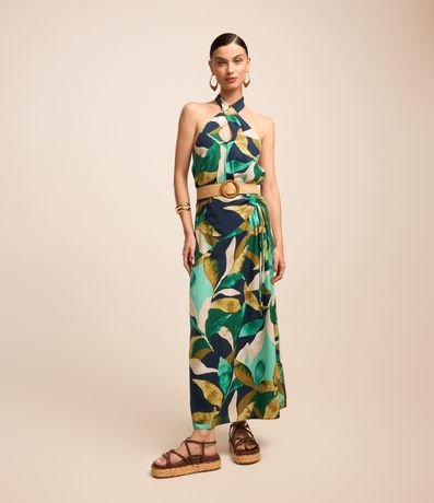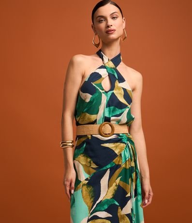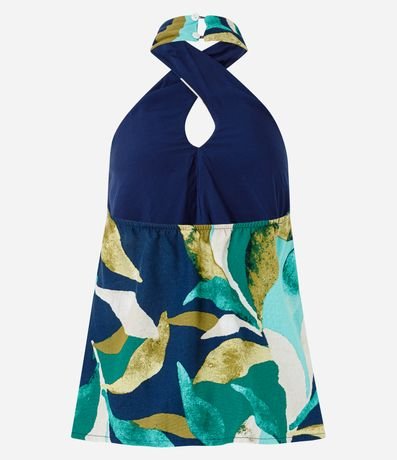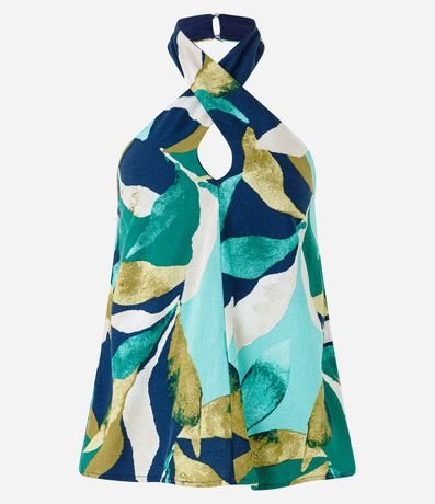 Ref: Blusa feminina, sem manga, confeccionada em viscolinho. Peça contém detalhes de pregas e transpassado e uma linda estampa de folhagem com cores contrastantes.