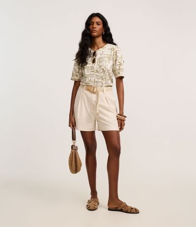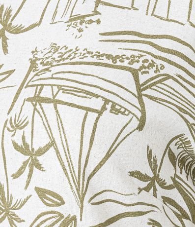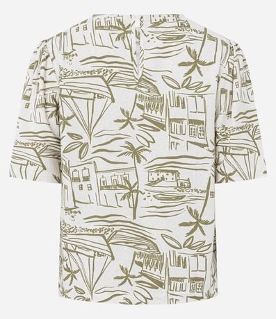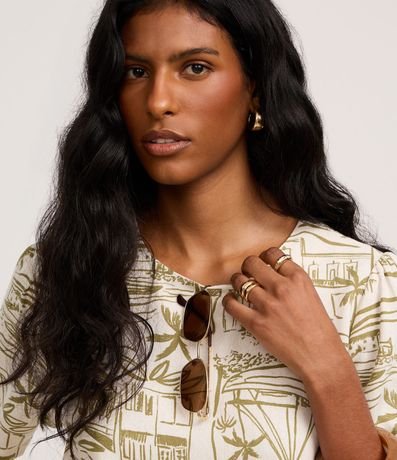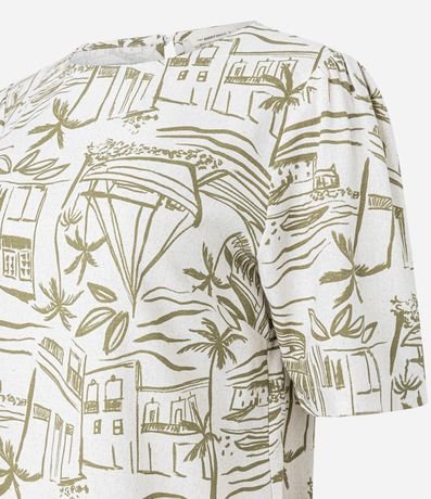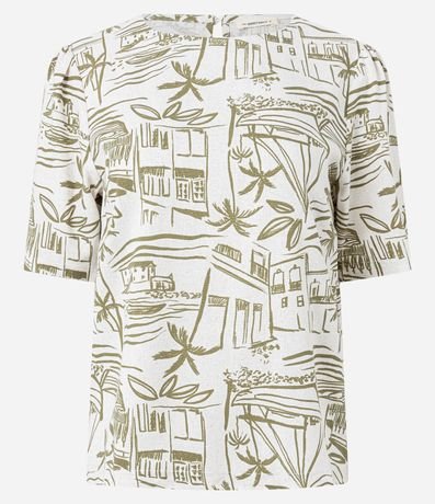 Ref: Blusa de mangas bufantes curtas, confeccionado m viscolinho, com gola redonda com fechamento por gota e estampa de vilarejo de praia. Este produto possui viscose certificada em sua composição, sendo ambientalmente mais responsável.