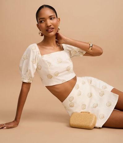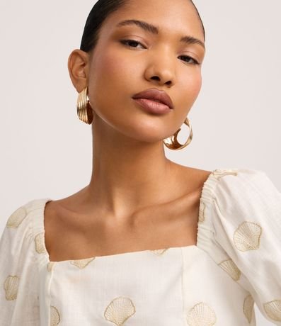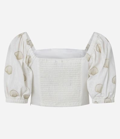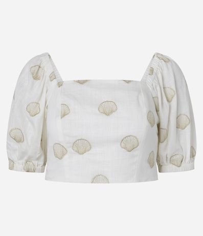 Ref: Blusa de mangas bufantes curtas, confeccionada em viscolinho, com decote quadrado, lastex nas costas e bordados de conchas com efeito metalizado. Este produto possui viscose certificada em sua composição, sendo ambientalmente mais responsável.