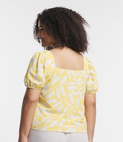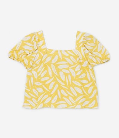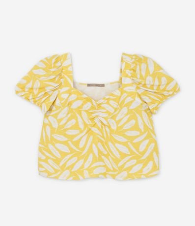 Ref: Blusa em viscolinho, com decote coração, mangas curtas bufantes e estampa folhas.