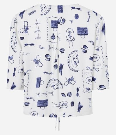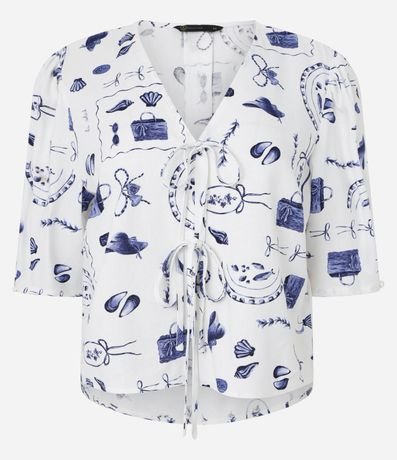Blusa de mangas bufantes curtas, confeccionada em viscolinho com 15% de linho, com gola V com amarração mais estamparia de acessórios de itens de praia. Este produto possui viscose certificada em sua composição, sendo ambientalmente mais responsável.
