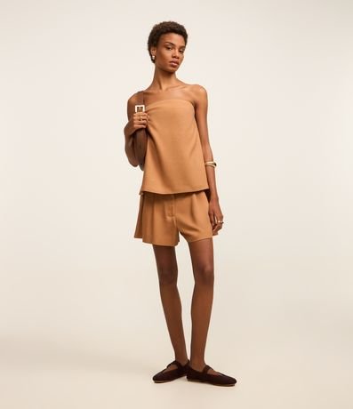 Ref: Blusa tomara que caia confeccionada em viscolinho, sem estampa e com detalhe de fenda na lateral da barra.