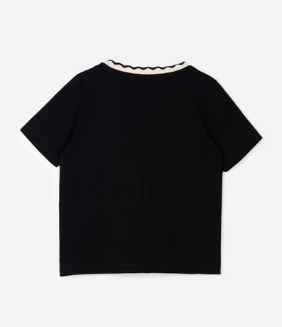 Ref: Blusa feminina confeccionada em viscolycra, de modelagem ampla, com mangas curtas e decote V. Sem estampa, possui detalhe de gola retilínea com ondinhas e mini fendas na barra.