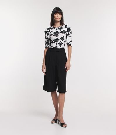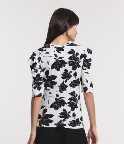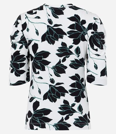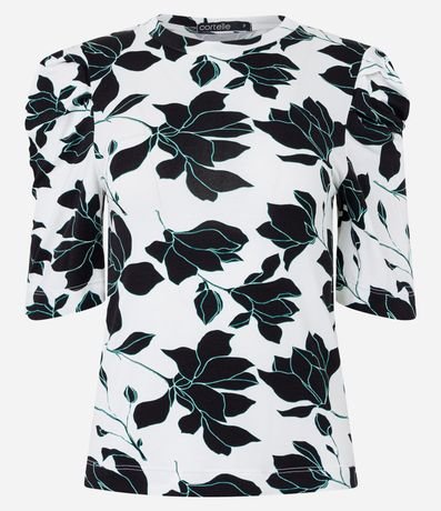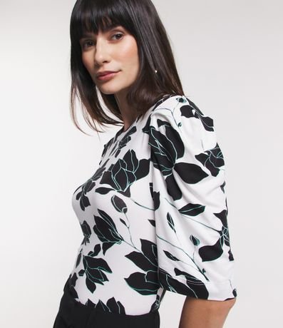 Ref: Blusa em viscolycra, com gola redonda, mangas curtas bufantes e estampa flores contrastantes.
