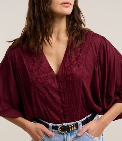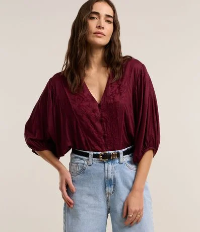 Ref: Blusa feminina, confeccionada em viscose, com abotoamento frontal, mangas 3/4 bufantes e texturas.