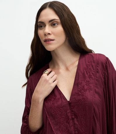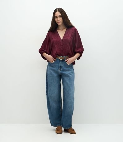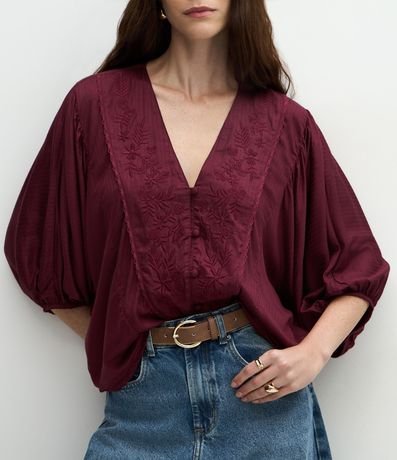 Ref: Blusa feminina, confeccionada em viscose, com abotoamento frontal, mangas 3/4 bufantes e texturas.