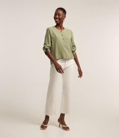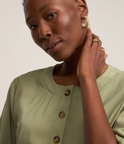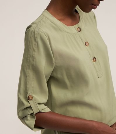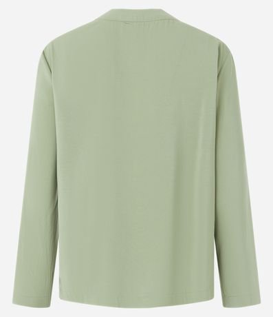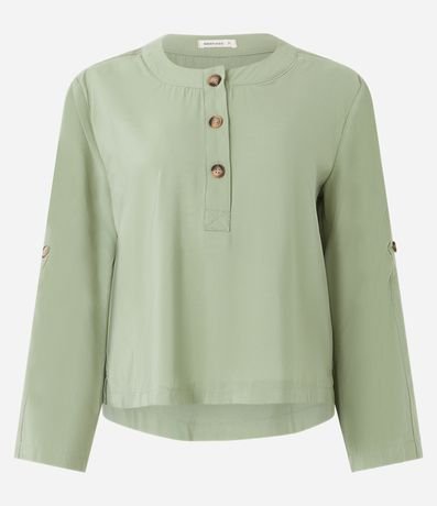 Ref: Blusa feminina, confeccionada em viscose, com gola redonda, abotoamento, mangas longas e superfície sem estampa.