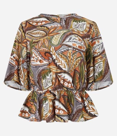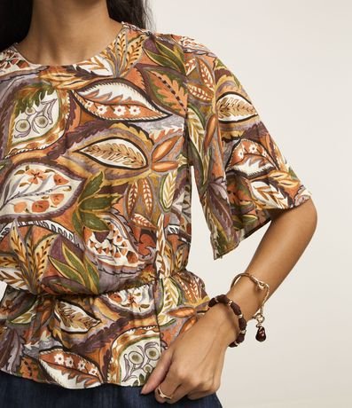 Blusa feminina, confeccionada em viscose, com gola redonda, mangas curtas amplas, com gola redonda e estampa paisley.