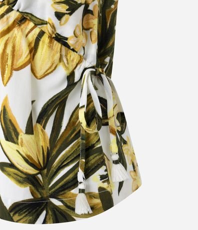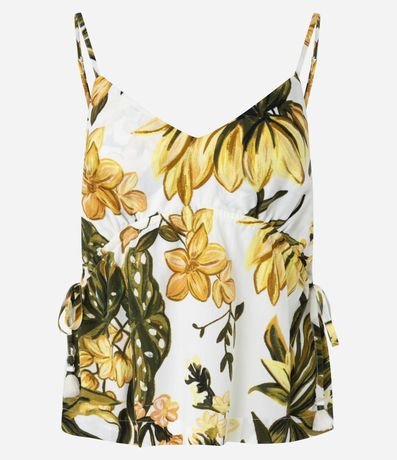 Blusa feminina em viscose certificada com decote em v, alças finas, amarração lateral e estampa floral.