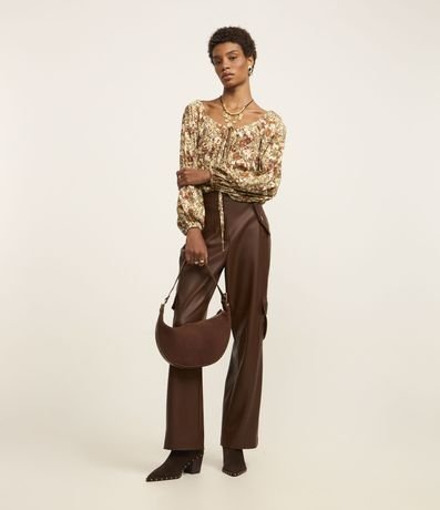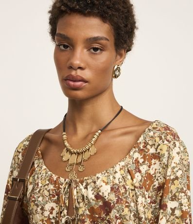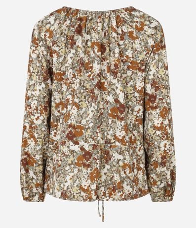 Ref: Blusa de mangas longas, confeccionada em viscose com gola redonda com amarração no decote, abertura vazada logo baixo do decote e estampa abstrata.