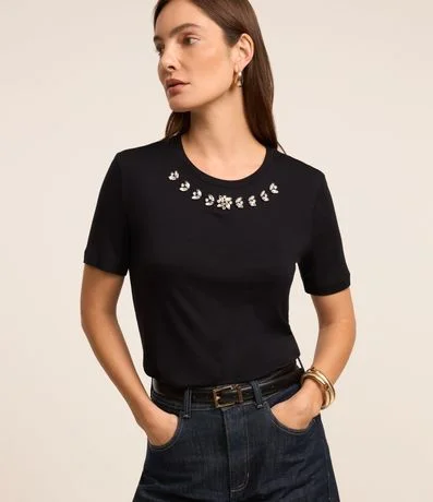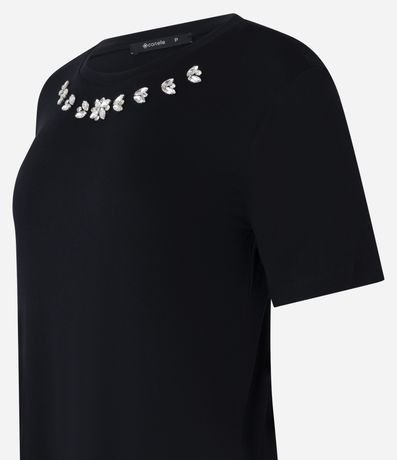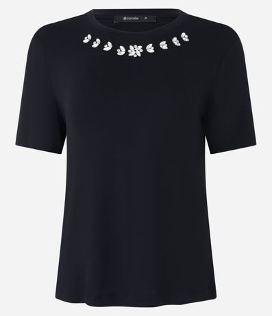 Blusa de mangas curtas confeccionada em viscose com gola redonda com brilhos em formas florais de chaton logo abaixo.