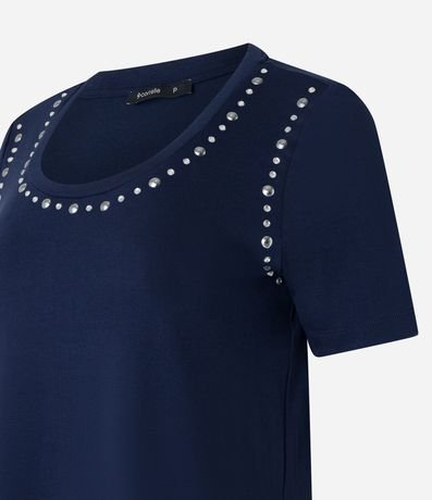 Ref: Blusa manga curta, confeccionada em viscose e com brilhos aplicados na gola e cavas.