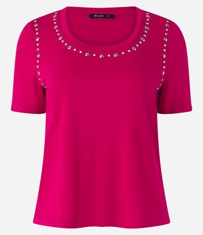 Ref: Blusa manga curta, confeccionada em viscose e com brilhos aplicados na gola e cavas.
