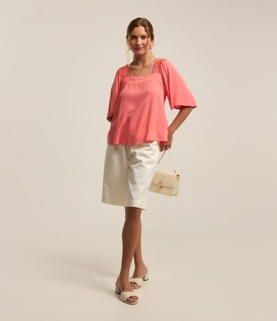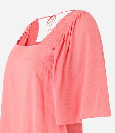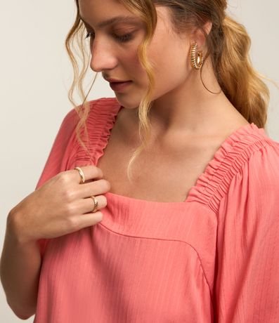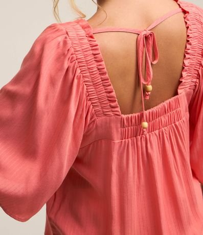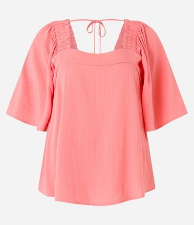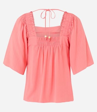Ref: Blusa feminina, confeccionada em viscose, com decote quadrado, mangas amplas e amarração no pescoço.