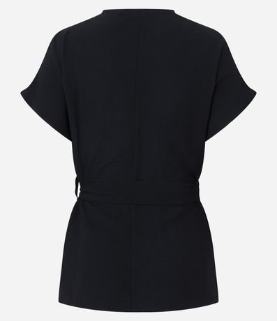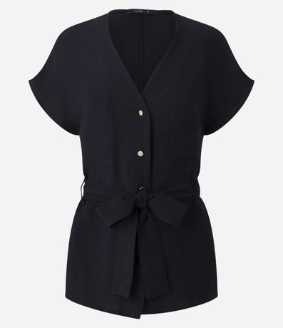 Ref: Blusa de mangas curtas sem cavas, confeccionada em viscose, com decote V, botões metalizados e cinto de amarração cintura. Este produto possui viscose certificado em sua composição, além de ter sido produzido através de processos mais sustentáveis, sendo ambientalmente mais responsável.
