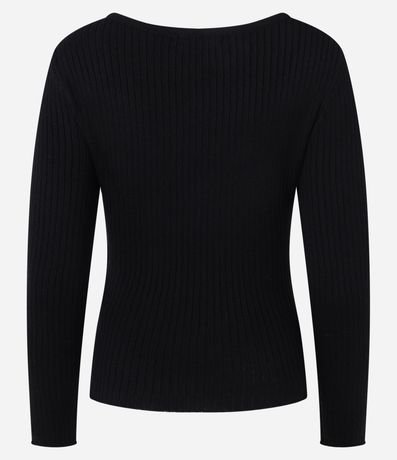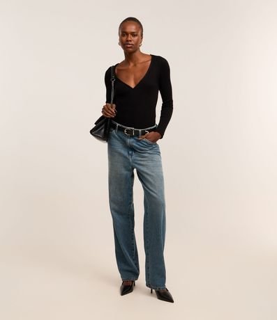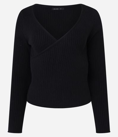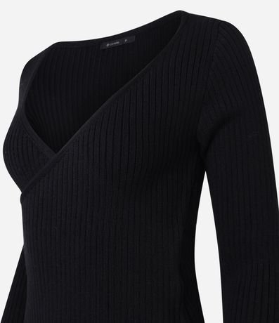 Blusa feminina, confeccionada em viscose, com decote V transpassado e mangas longas.