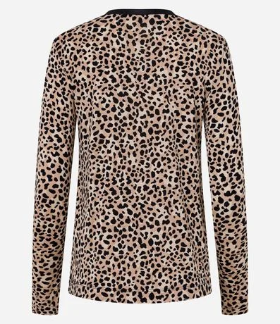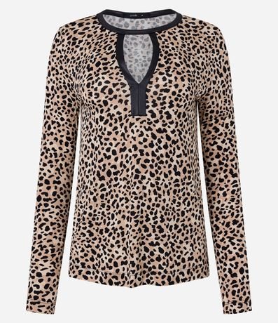 Ref: Blusa em viscose, com gola redonda, recorte vazado frontal, detalhes em pu na gola e estampa animal print onça.
