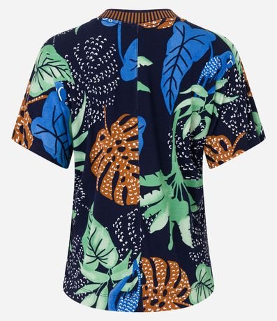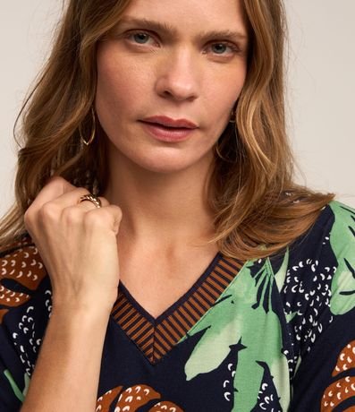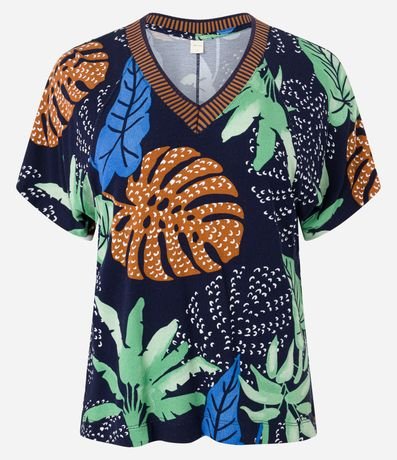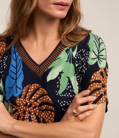 Ref: Blusa feminina confeccionada em viscose, com decote V detalhado, mangas curtas e estampa folhagens.