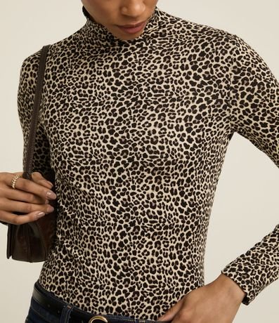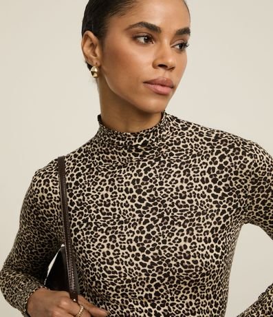 Blusa feminina confeccionada em viscose mais sustentável com elastano, peça com gola alta redonda e manga longa, uma estampa de animal print oncinha.