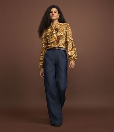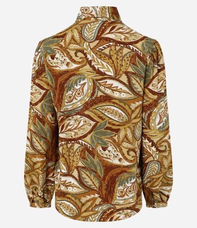 Ref: Blusa de mangas longas bufantes, confeccionada em viscose com gola laço além de estamparia paisley.