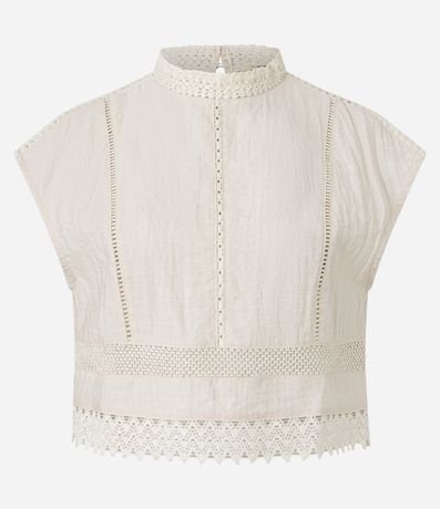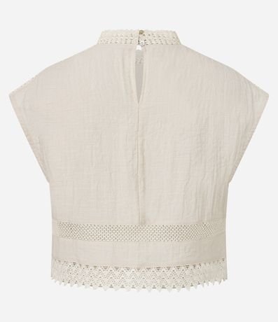 Blusa sem mangas, confeccionada em viscose, com gola padre com fechamento por gota, entremeios, e renda de efeito crochê na barra. Este produto possui material mais sustentável em sua composição, sendo ambientalmente mais responsável.