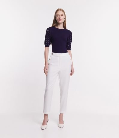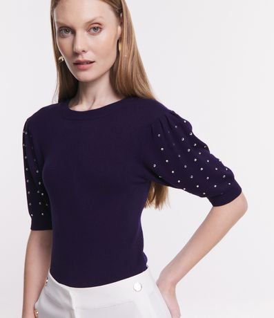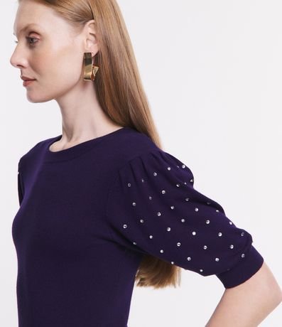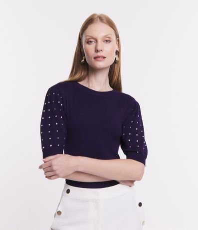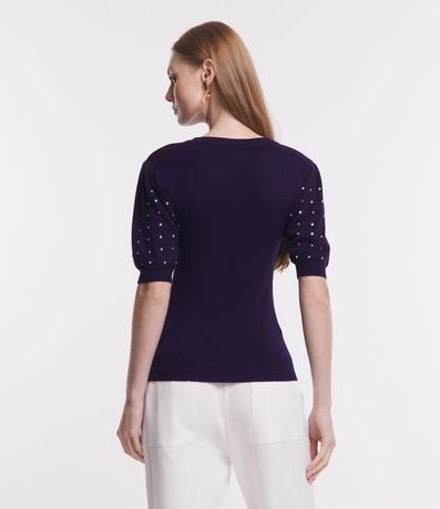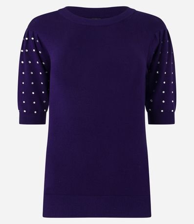 Ref: Blusa em viscose, com gola redonda, mangas curtas e aplicação de strass.