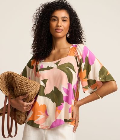 Blusa de mangas curtas godês com decote quadrado com amarração nas costas além elásticos nos ombros e estamparia de folhagens coloridas em estilo aquarelado. Confeccionada em viscose mais sustentável.