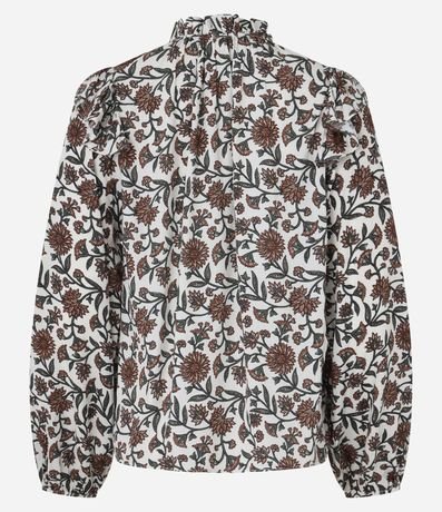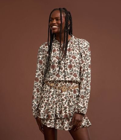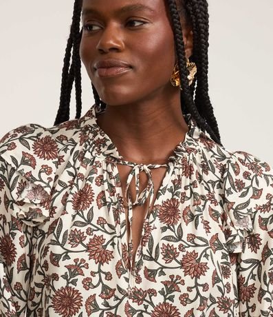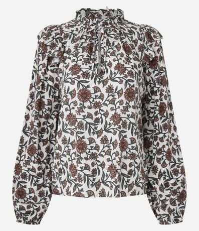 Ref: Blusa feminina confeccionada em viscose mais responsável, de modelo over, com gola altinha e mangas longas bufantes. Possui amarração na gola, babados nos ombros e estampa floral.