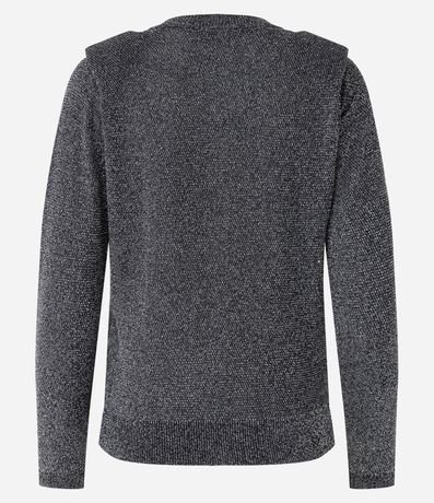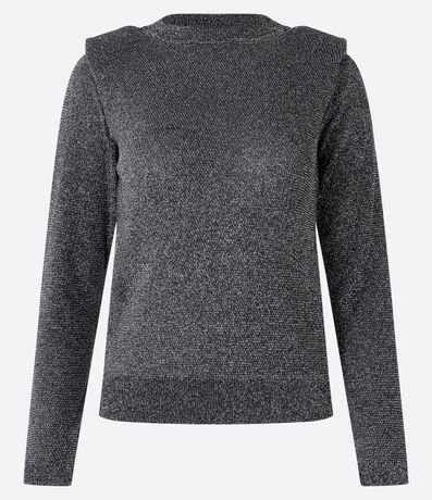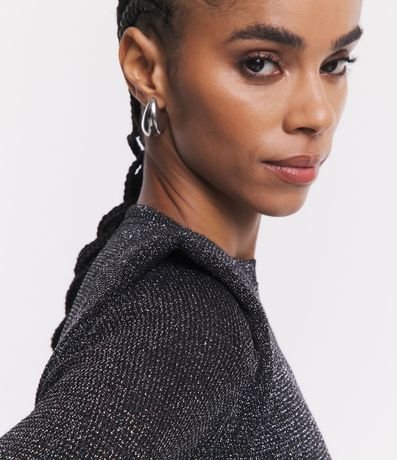 Blusa em viscose, com gola redonda, mangas longas, ombreira e superfície com brilho.