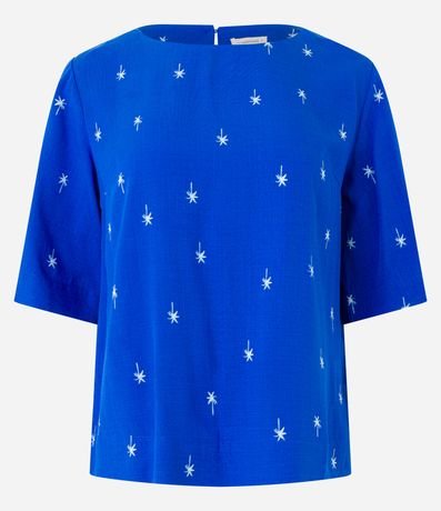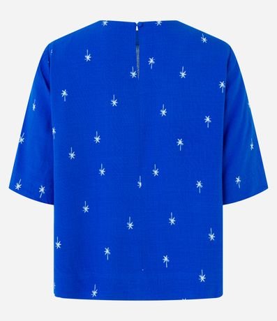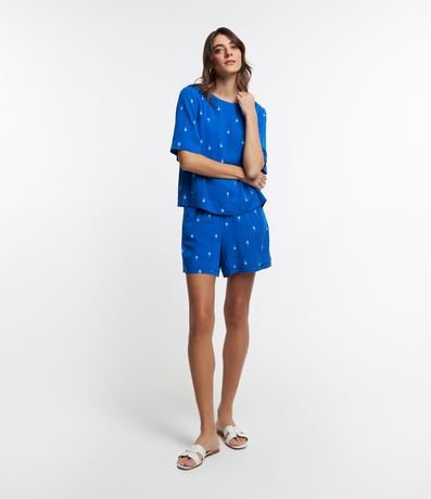 Ref: Blusa feminina, confeccionada em viscose, com gola redonda, mangas curtas e padronagem de coqueirinhos.