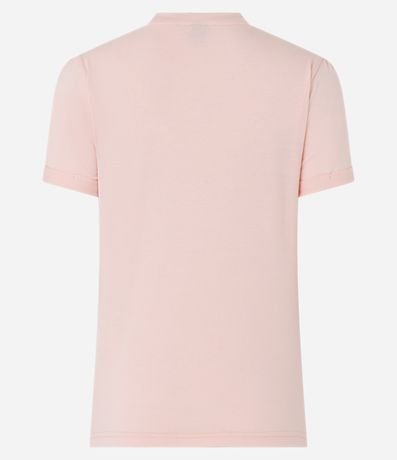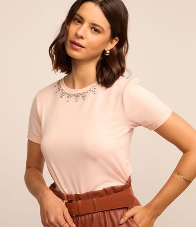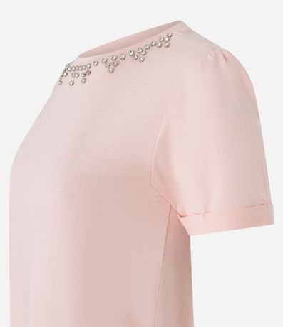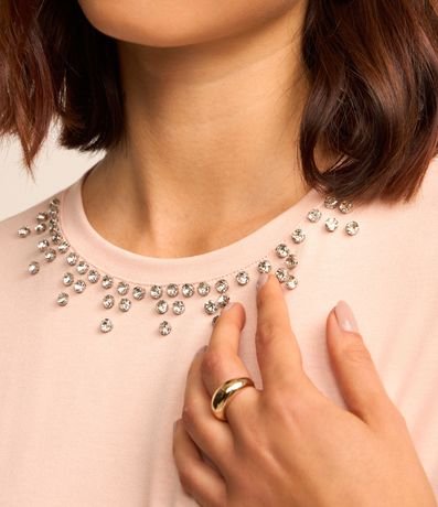Ref: Blusa feminina, confeccionada em viscose, com gola redonda, mangas curtas e detalhes de strass.