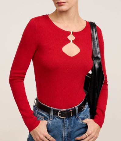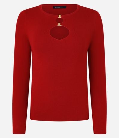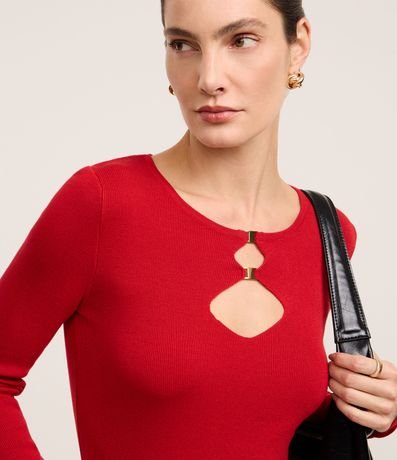Blusa de mangas longas confeccionada em viscose mais sustentável com gola redonda com abertura circulares logo abaixo. Os vazados no busto possuem detalhes metalizados que se assemelham a fivelas. Tecido com textura canelada.