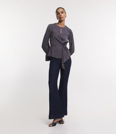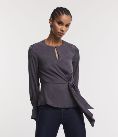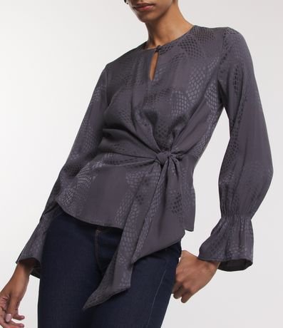 Ref: Blusa feminina confeccionada em viscose jacquard, com gola redonda e manga longa bufante. Possui textura animal print de cobra, recorte na cintura, amarração frontal e babado nos punhos.