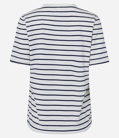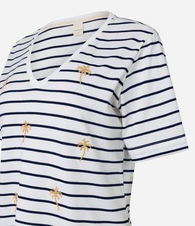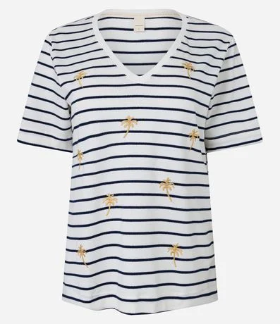 Ref: Blusa de mangas curtas confeccionada em viscose com gola V, listras horizontais e bordados de coqueiros na parte frontal.