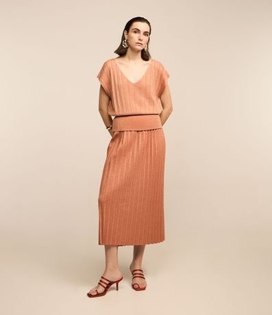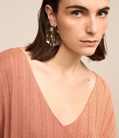 Ref: Blusa de mangas curtas confeccionada em viscose com decote V e fios metalizados alél textura com efeito plissado. Possui design mais ajustado na cintu.