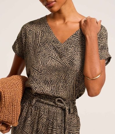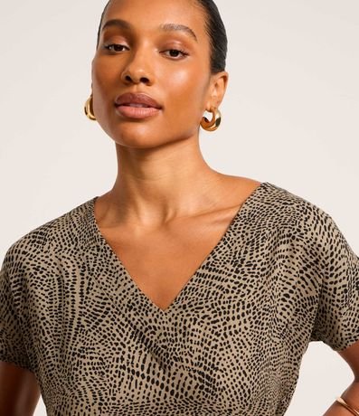 Blusa de mangas curtas, confeccionado em viscose, com decote V e estamparia abstrata com formatos de pingos. Este produto possui viscose certificada em sua composição, sendo ambientalmente mais responsável.