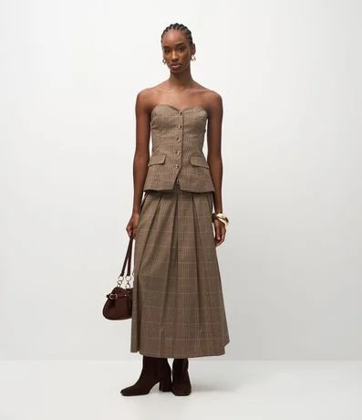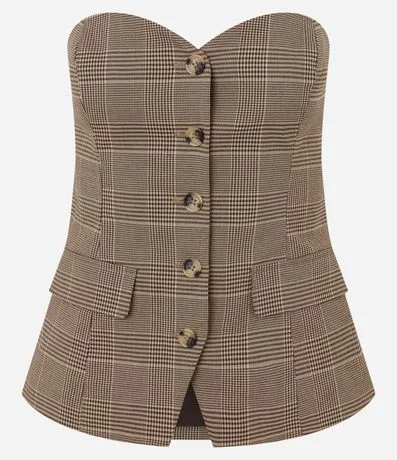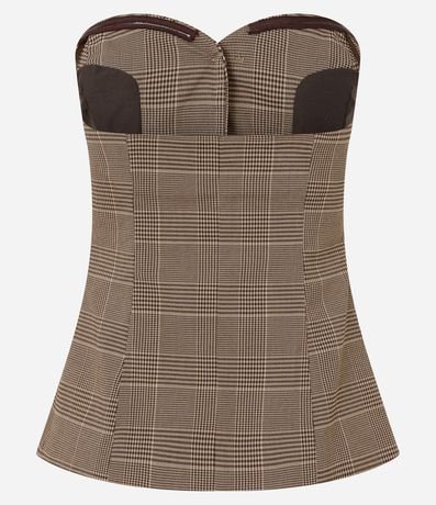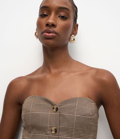 Ref: Blusa feminina confeccionada em crepe de alfaiataria, sem mangas, com decote coração e estampa fullprint xadrez Príncipe de Gales, apresentando vista frontal com botões aparentes e bolsos decorativos que reforçam o visual estruturado e sofisticado, ideal para composições fashion com elegância contemporânea.