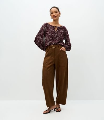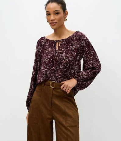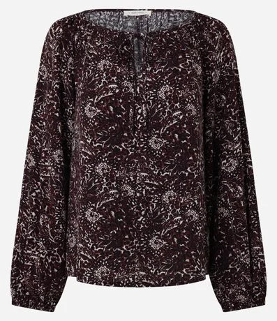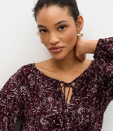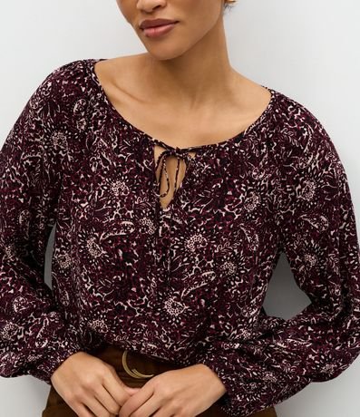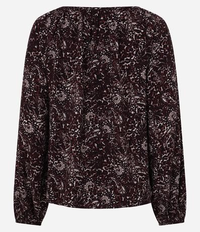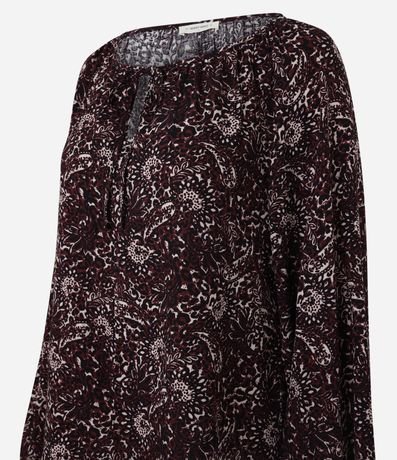 Ref: Blusa feminina confeccionada em chalis de viscose mais sustentável, com manga longa, decote canoa e estampa fullprint de folhagens, apresentando detalhe de amarração frontal que valoriza o visual com leveza e sofisticação, ideal para composições elegantes no dia a dia.