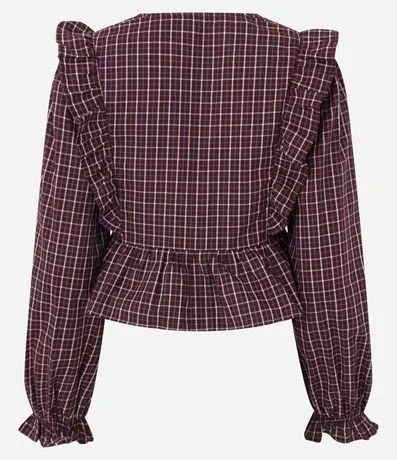 Blusa feminina confeccionada em tricoline de algodão mais sustentável, com manga longa, decote em V e estampa xadrez fullprint, apresentando modelagem bata com recorte abaixo do busto e babados frontais que acrescentam feminilidade e movimento ao visual, ideal para composições casuais com estilo clássico.